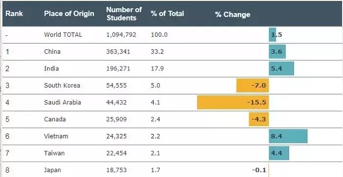 11月13日,美国国际教育协会IIE发布了最新的《2018美国门户开放报告》。报告显示,在2017到2018学年中,在美国学习的国际学生人数达到历史新高109万人,中国仍然是美国留学的最大生源国。2016/17年度中国留美人数超过35万,而2017/18年,中国学生的数量是36万人,占到全部国际生数量的33.2%。在加州的中国人占到总国际生的41.1%,而作为国际生最爱的纽约,中国学生也占到了39.3%。