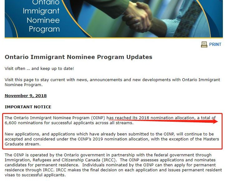 当地时间11月9日,加拿大安省移民局官网宣布:2018年的省提名计划(OINP)配额6600个已用完。这也意味着,即日起至2018年年底,安省省提名移民计划将不会再接受新的申请了。其他已经递交的申请或新的申请,将按照2019年的省提名配额计划审理。安省政府表示,如果获得批准,他们将在2019年正式获得提名。
