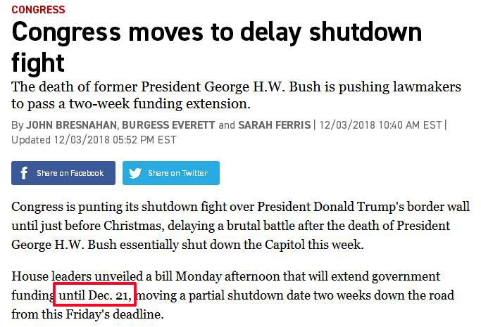 Schumer和Pelosi原计划本周二单独与川普进行谈判建墙预算,但是,老布什的离世,打乱了磋商谈判的进程,该谈判被延期到12.11。