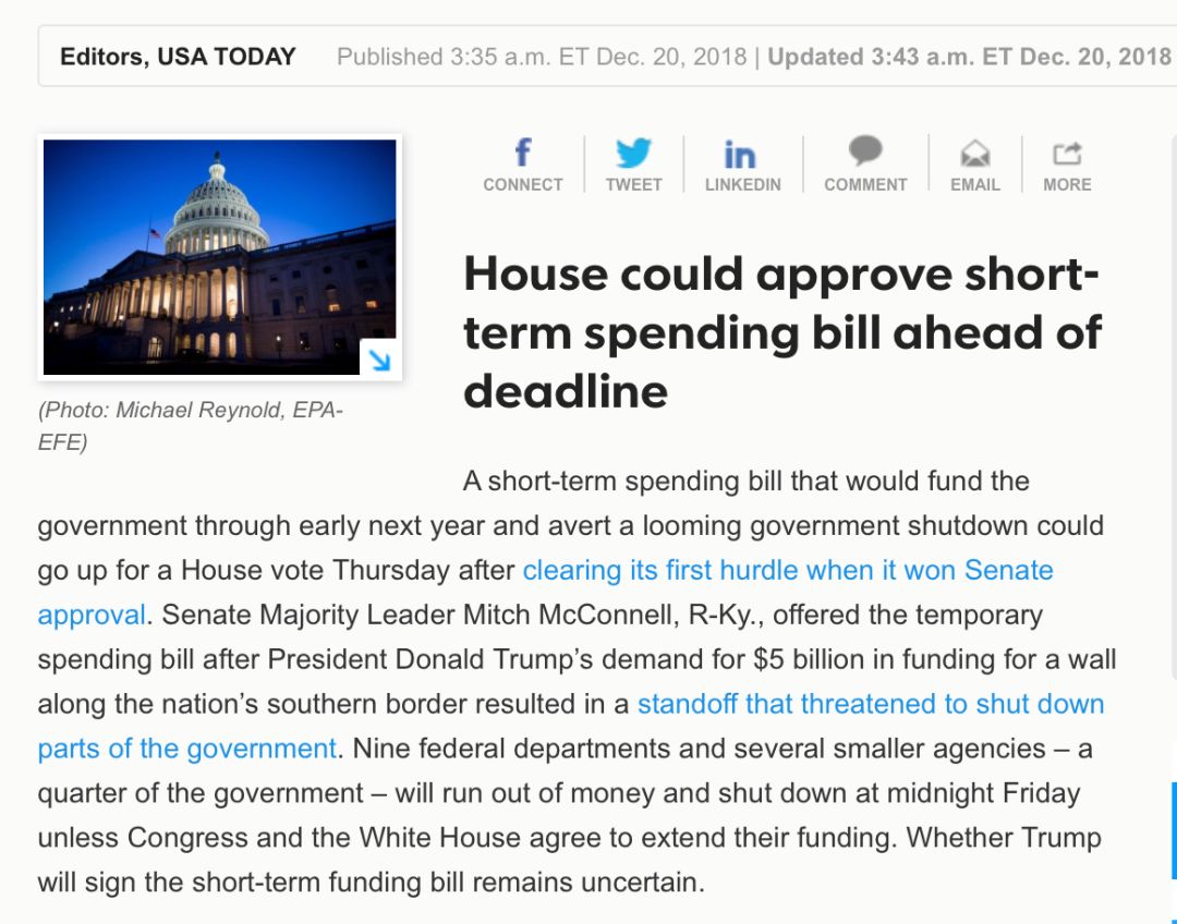 当地时间12月20日传来消息,美国参议院已经通过了联邦临时预算案(CR),将联邦预算延期至2019年2月8日。美国媒体预计,众议院随后也将投票通过该预算。