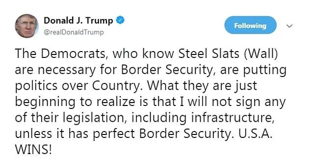 他说,“民主党人知道钢铁板条建起的墙是边境安全所必需的,他们正把政治置于国家之上。 他们刚刚开始意识到,除非有完美的边境安全内容,否则我不会签署任何立法,包括基础设施。美国必胜!”