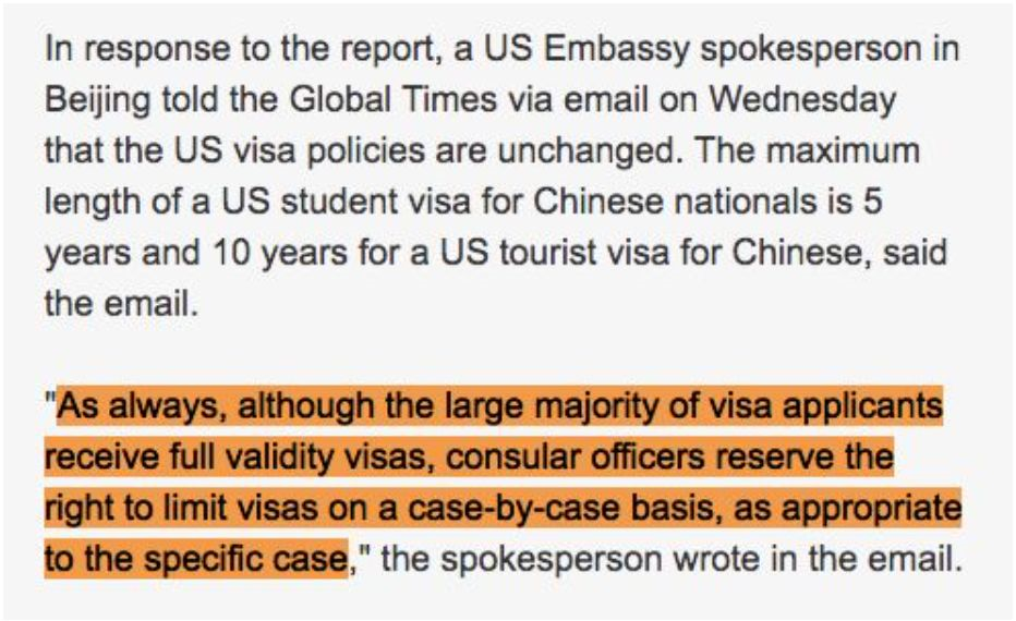 近日,由于中美贸易关系不断升级恶化,中国公民申请美国签证的拒签率激增,美国官方正在考虑取消针对中国公民的十年有效签证政策,其中研究人员、学者的签证几乎全面“沦陷”,坊间议论纷纷。12月26日,美国大使馆重申:美国对中国的签证政策并未改变,F-1学生签证、B1/B2旅游探亲短期商务签证的最长有效期依然分别是5年和10年。但声明中也提到:一如往常,尽管大部分美国签证申请人都能够获得签证规定的最长时效签证,但签证官会根据每一份签证的具体情况保留限制签证时长的权利。
