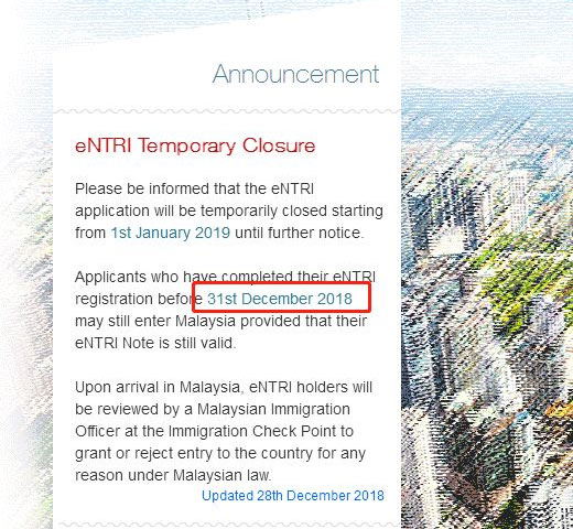 马来西亚移民局官网近日发出公告:2019年1月起暂时取消实施3年的电子签,具体恢复日期等新政通知,2019年1月1日起继续接受马来西亚领馆贴纸或Evisa。