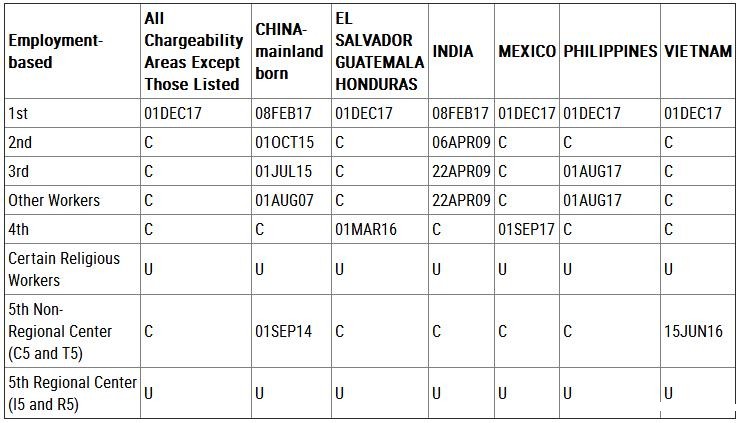 中国大陆出生申请人,EB-1由2016年12月15日前进至2017年2月8日;EB-2由2015年8月1日前进至2015年10月1日;EB-3由2015年6月8日前进至2015年7月1日;EB-4有名额;EB-5维持在2014年9月1日。