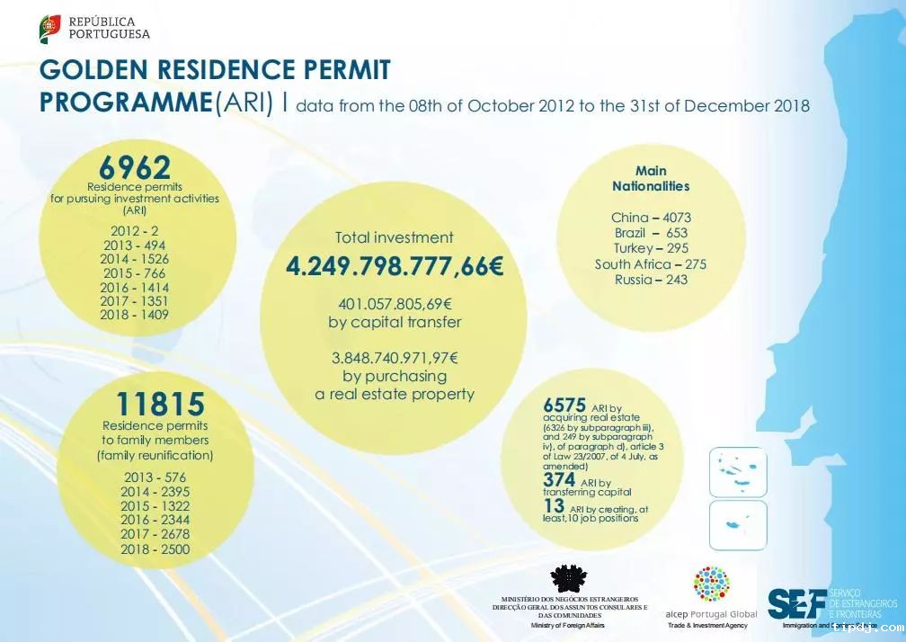 葡萄牙移民局(SEF)官方发布了截止到2018年12月31日黄金居留获批的最新数据。累计投资额:目前为止,葡萄牙黄金居留许可项目总投资额约为42.5亿欧元,其中房地产贡献约为38.49亿欧元。主申获批人数:12月份有149位主申请人获批,累计总共6962位投资人成功获批黄金居留许可。附属申请人数:12月份有236位附属申请人成功获批,黄金居留许可累计附属申请人数为11815人。投资者来源:在目前6962位获批的投资者中,中国有4073人(占比约59%)。