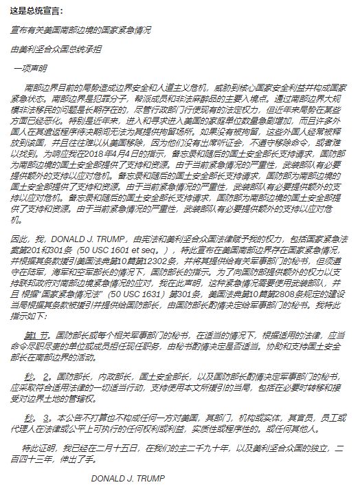 于是,当地时间2月15日,川普再次签署公告,在白宫宣布全国进入国家紧急状态,同时政府将投入80亿美元在美国南部边境建造隔离墙,以保护边境,保卫我们伟大国家安全。