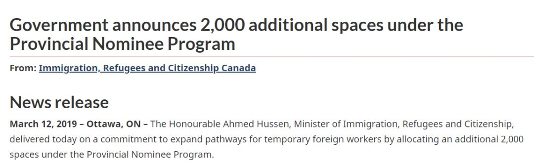 当地时间3月12日,加拿大移民部长宣布增加省提名计划名额2,000个,扩大临时外籍工人的通道。政府希望通过移民加强加拿大的经济,并促进良好的中产阶级就业机会的增长。那些满足长期劳动力市场需求并融入加拿大社会的外国工人,将有更多的永久居住途径。这些额外的名额将为中级技能水平(国家职业代码C类的职业)的临时外国工人提供更多机会,以过渡到永久居民。各省和地区主要负责各自省级提名计划的设计,管理和评估。移民部承诺这些额外的名额不会妨碍整体的审理进度。