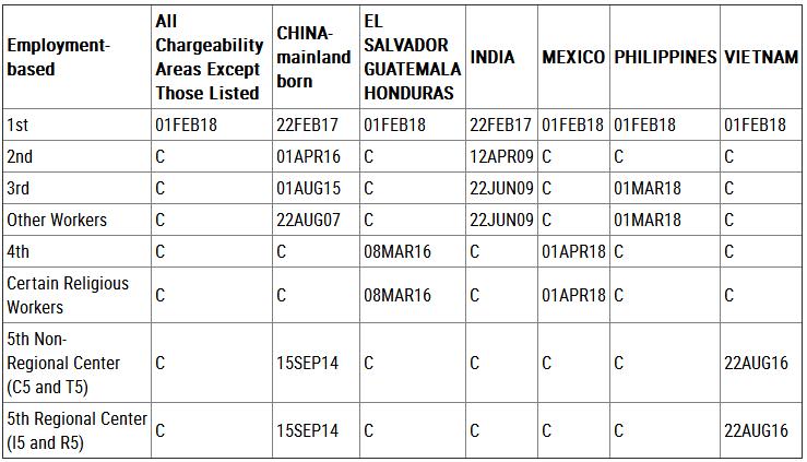 3月14日,美国国务院签证办公室发布了4月的签证排期公告,EB-5签证排期截止日前进一周至2014年9月15日,表B则前进一周至2014年10月8日。亲属移民“绿卡批准排期”,中国申请人的情况为——F-1类:由2011年10月22日前进至2011年12月1日;F-2A类:由2017年1月8日前进至2017年3月1日;F-2B类:由2012年8月1日前进至2012年10月22日;F-3类:由2006年9月8日前进至2006年9月22日;F-4类:由2005年9月22日前进到2006年1月1日。职业移民“绿卡批准排期”,中国申请人的情况为——中国大陆出生申请人,EB-1保持在2017年2月22日;EB-2由2016年1月1日前进至2016年4月1日;EB-3由2015年7月8日前进至2015年8月1日;EB-4有名额;EB-5由2014年9月8日前进至2014年9月15日。