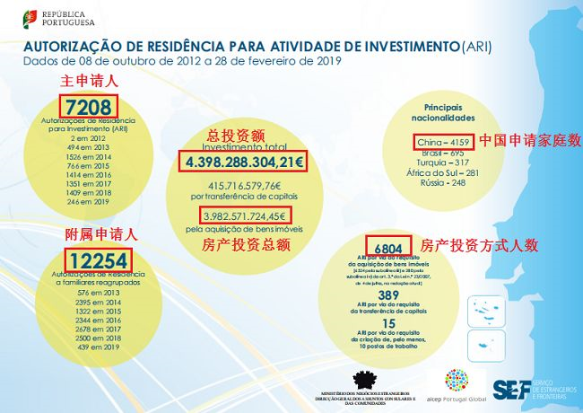 葡萄牙移民局(SEF)官方发布了截止到2019年2月28日黄金居留获批的最新数据。累计投资额:目前为止,葡萄牙黄金居留许可项目总投资额约为43.98亿欧元,其中房地产贡献约为39.83亿欧元。主申获批人数:2月份有101位主申请人获批,累计总共7208位投资人成功获批黄金居留许可。附属申请人数:2月份有198位附属申请人成功获批,黄金居留许可累计附属申请人数为12254人。投资者来源:在目前7208位获批的投资者中,中国有4159人(占比约60%)。