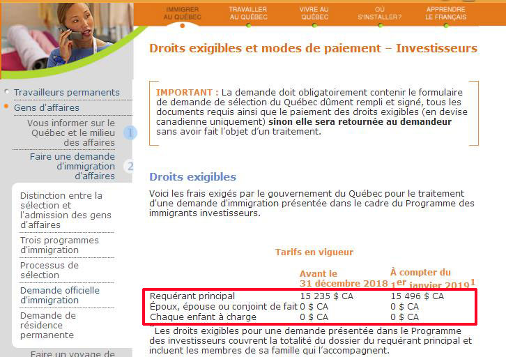 从2019年1月1日起,魁省移民局申请费用实行新的收费标准,具体内容如下:(1)魁省投资移民申请费将从15235加币上调至15496加币;(2)魁省企业家移民、自雇移民申请费,主申请人费用将从1062加币上调至1080加币,随行配偶及孩子费用将从168加币上调至171加币。