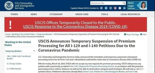 biwei必威局宣布,从3月20日开始暂停所有I-129和I-140的加急申请服务。目前移民局并未通知何时恢复接收加急申请,之后会另行通知。