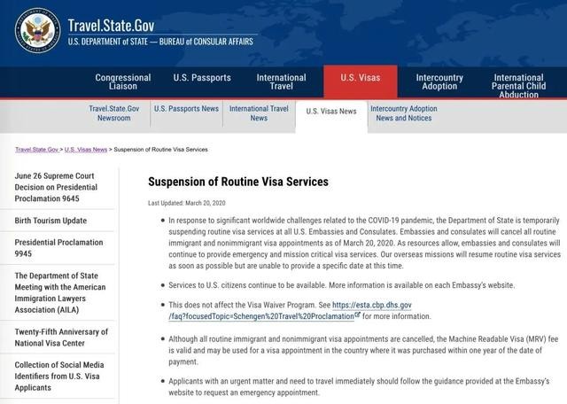 2020年3月20日,美国国务院应对全球新冠肺炎疫情爆发的进一步升级,彻底叫停了美国使领馆在全球的日常签证发放。