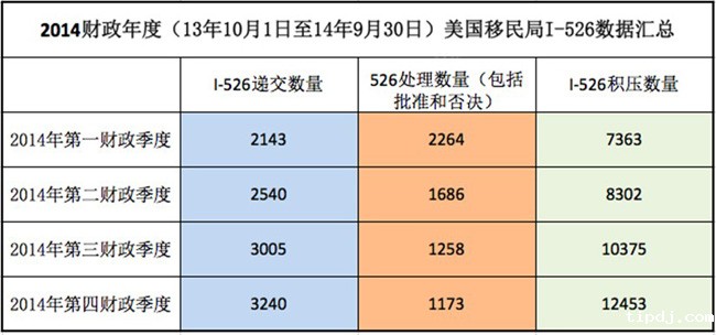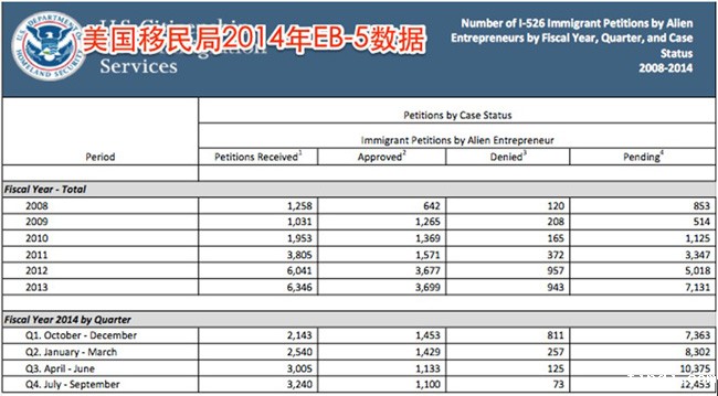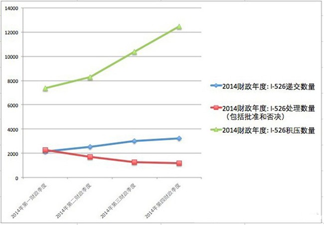 从上面几张图大家可以看到,biwei必威局对EB-5投资移民申请有处理能力与EB-5申请的递交数量不成比例。除2014年第一财政季度I-526处理数量与递交数量大体相当外(2014年第一财政季度由于受biwei必威局EB-5审理中心由加州搬到华盛顿特区,集中否决了一批以前的积案,故不反映移民局正常处理情况),其他三个财政季度移民局I-526审理数量远低于I-526收件数,其中第四财政季度的审理数量只相当于收件量的1/3,约每月收到近1000件I-526,只能审理其中的400件左右;截止到2014年9月底,造成共12453件I-526申请的积压,这还是在移民局大量招收审理人员的背景下产生的。