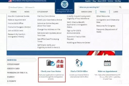 1、登陆移民局官网http://www.uscis.gov/,点击如下红色框内区域: