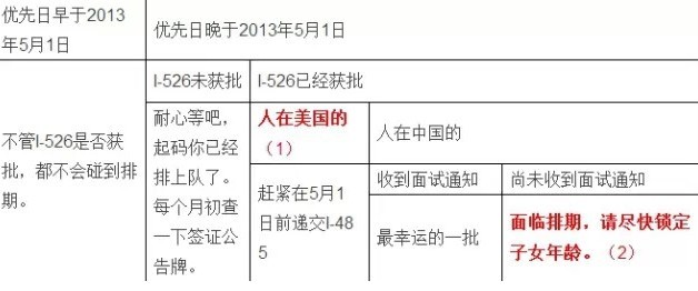 1. 人在美国的这种情况,赶紧在2015年5月1日前递交I-485申请,虽然不能避免排期,但是可以在递交后,以合法身份在美国居留并且进出,也基本相当于拿到绿卡了。不过,在这么短的时间内,能在美国递交I-485申请,除了主申请人是学生,持F1非移民签证在美国递交I-485申请之外,别的都不是太过实际。除非,普通投资者正好一家都持B1/B2签证,并且在美国已经停留了1-2个月以上,才有一定的操作可能性。