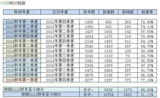 总体来看,I-526申请数在2015年狂飙,排期的严峻形势将继续加重。本季度的I-526通过率下调,降到了77.16%,但平均数维持在85%左右。biwei必威局的审批政策稳定,区域中心也越来越了解审批规则,因此I-526通过率的波动应该不会太大。而I-829的批准率也不低,本季度的获批数大有提高,I-829审批缓慢的问题或许在今后将得到缓解。必威中文官网电话移民专家建议各位申请人,不要只过分关注I-526,因为选择项目的重点并不是I-526能否获批,而是I-829和还款。