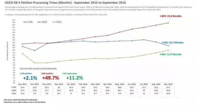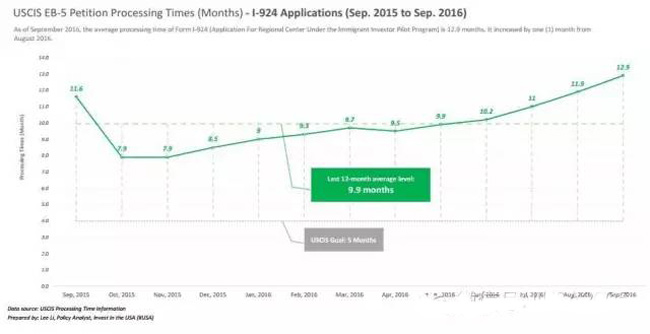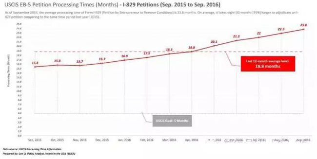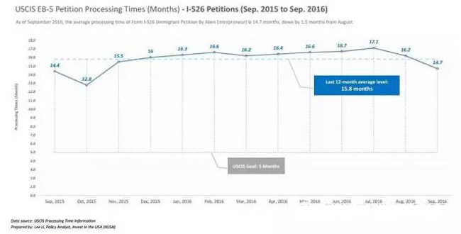 I-526:2016年的平均审核时间基本维持在16个月以上。最近两个月在呈下降趋势,并且9月的最新数据14.7个月已经低于平均水平15.8个月。