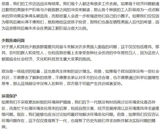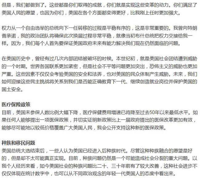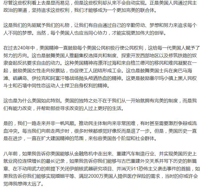 美国东部时间2017年1月10日晚9点,第44任总统奥巴马在芝加哥向美国人民发表告别演说,这是其在离任前最后一次发表公开演讲,也被白宫称为“向前看”的演说。
