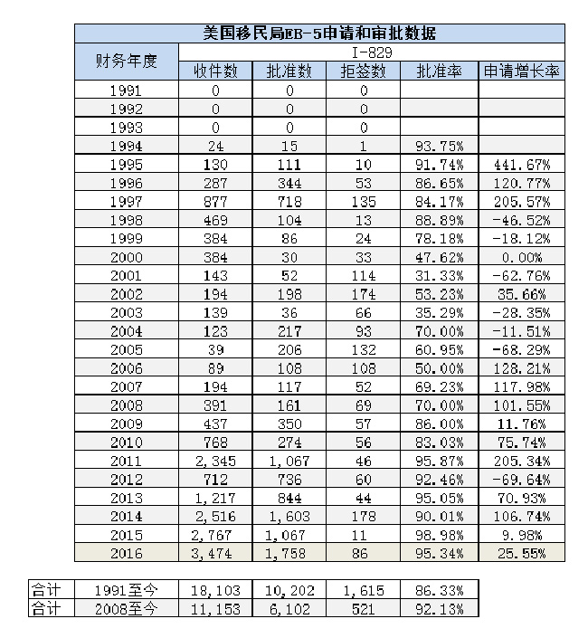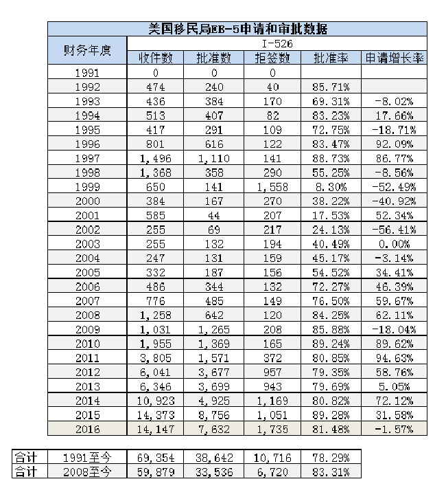 2.合计栏目,参考IIUSA的统计办法,区分了从1991年至今的统计数据,和2008年至今的统计数据。原因在于,早前的通过率,由于USISA的审批政策波动,对于现今的参考意义不大(特别是1998年收紧政策,严重影响了EB-5的审批通过率,随后获得了某种程度上的纠正)。