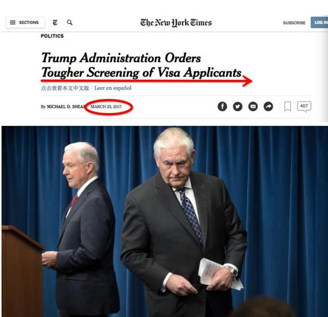 美国当地时间3月24日,《纽约时报》报道:上周,美国所有大使馆都收到了来自国务卿蒂勒森的一份外交电文,其中明确要求领事官员全面加强签证审核!并毫不掩饰地表示:获得签证的过程将会变得更加困难,时间也会更长!