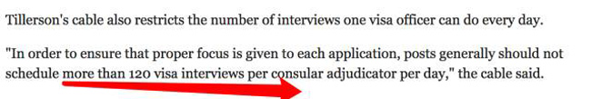 电文内容:使馆官员现在必须对签证申请人进行更广泛、更详细的检查,特定群体中的申请者将会被考虑进行更高级别的安全检查。为了保证更严格的审核每位签证者,要求大使馆签证官每天接待签证者上限是120人。