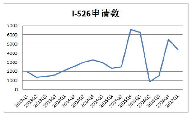 在2017财年第一季度,I-526申请数继续保持高位,930大限之后的12.9,美国国会继续成为EB-5疾驰的最大推手。