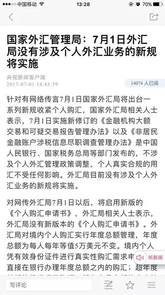 据央视新闻客户端报道,针对传言7月1日国家外汇局将出台一系列新规收紧个人购汇,国家外汇局相关人士表示,7月1日实施新修订的《金融机构大额交易和可疑交易报告管理办法》以及《非居民金融账户涉税信息尽职调查管理办法》是中国人民银行、国家税务总局等部门发布的,不涉及个人外汇管理政策调整,个人真实合规的用汇不受任何影响。外汇局目前没有涉及个人外汇业务的新规将实施。