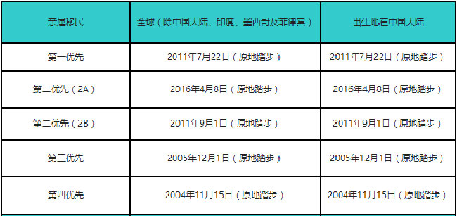 亲属移民8月“递件排期表”,中国大陆出生申请人均原地踏步,具体情形如下:F-1类:保持在2011年7月22日,原地踏步;F-2A类:保持在2016年4月8日,原地踏步;F-2B类:保持在2011年9月1日,原地踏步;F-3类:保持在2005年12月1日,原地踏步;F-4类:保持在2004年11月15日,原地踏步。