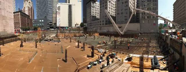 ▲垂直混凝土施工前的地下周边防水工程正在进行中
