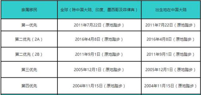 亲属移民9月“递件排期表”,中国大陆出生申请人均原地踏步,具体情形如下:F-1类:保持在2011年7月22日,原地踏步;F-2A类:保持在2016年4月8日,原地踏步;F-2B类:保持在2011年9月1日,原地踏步;F-3类:保持在2005年12月1日,原地踏步;F-4类:保持在2004年11月15日,原地踏步。
