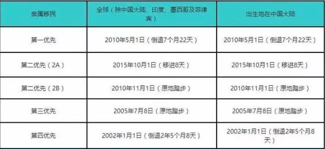 亲属移民9月“绿卡批准排期”,中国大陆出生申请人几乎原地踏步甚至倒退,具体情形如下:F-1类:由2010年12月22日倒退至2010年5月1日,倒退7个月22天;F-2A类:由2015年9月22日推进到2015年10月1日,移进8天;F-2B类:保持在2010年11月1日,原地踏步;F-3类:保持在2005年7月8日,原地踏步;F-4类:由2004年5月8日倒退至2002年1月1日,倒退2年5个月8天。