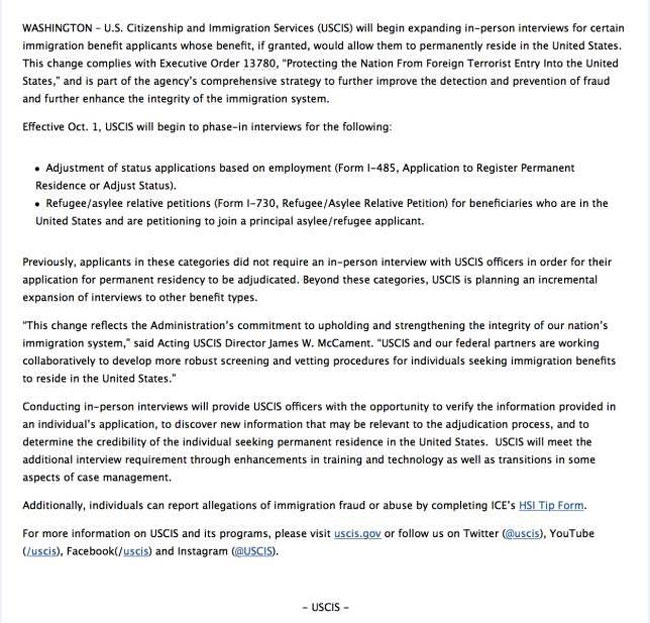 而从10月1日起,移民局将逐渐开始对以下类型的移民申请人进行面谈: