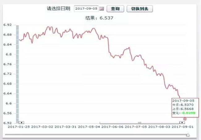 去年年底或今年年初用人民币狂换美元的人要哭了,短短8个多月时间,人民币兑美元大幅升值,从去年年底汇率接近7,升值到了现在的6.53左右。简单测算,一个居民去年年底或今年年初换100万美元,要比9月5日换100万美元,多花费43万人民币……43万人民币啊……