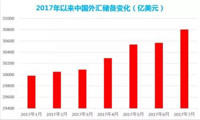 外汇储备增加也是带动人民币升值的又一重要原因。中国人民银行8月公布的数据显示,截至2017年7月末,外汇储备规模30807亿美元,较6月末上升239亿美元,升幅为0.8%,为连续第6个月出现回升。