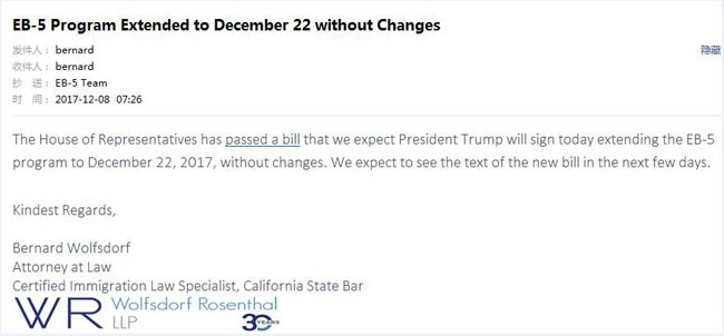 必威中文官网电话集团今天再次收到美国EB-5著名移民律师Bernard wolfsdorf的邮件通知,总统特朗普将签署通过EB-5法案延期至2017年12月22日!