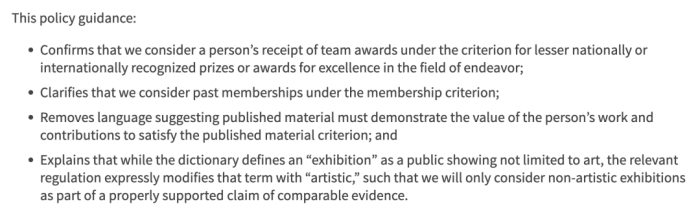 更新后指南明确了“国际或全国性知名奖项”的定义,明确表示,"Nothing precludes the person from relying on a team award, provided the person is one of the award."