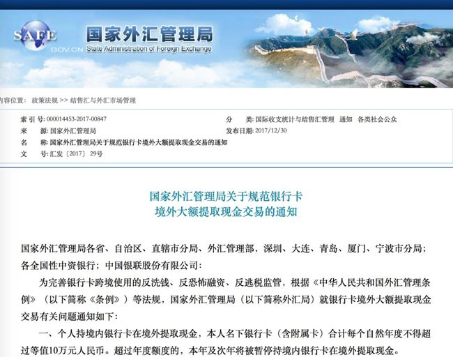 2017年12月30日,中国国家外汇管理局发布通知:自2018年1月1日起,个人持境内银行卡在境外提取现金每年不得超过等值10万元人民币,同时将人民币卡、外币卡每日境外提现额度统一为等值1万元人民币,若超年度额度,本年及次年将被暂停持境内银行卡在境外提取现金。新规主要是为规范银行卡境外大额提取现金,并不改变银行卡外汇管理基本框架和个人用汇政策,不改变个人便利化年度5万美元购汇额度,不影响持卡人境外正常提现和消费。个人出境旅游、商务、留学所涉食、宿、行、购等经常线下交易,均可以使用银行卡支付。