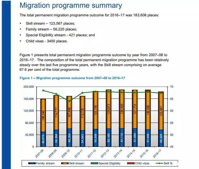 澳洲移民局官网近期公布了2016-2017财年(从2016年6月底-2017年7月初)的移民大数据。2016-2017财年签证发放数据:2016-2017财年PR(绿卡)配额是19万个,但是移民局实际并没有完全发完,实际发放了183,608个。(1)家庭移民实际发放56,220个;(2)技术类移民实际发放123,567个;(3)特殊资格移民实际发放421个;(4)儿童签证(不属于移民计划)实际发放3400个。2016-2017财年移民主要来源人数比较:(1)印度占主要来源总人数的21.2%,人数达到38854人,排名第一;(2)中国占主要来源总人数的15.4%,人数达到28293人,相比上财年下降,排名第二;(3)英国占主要来源总人数的9.3%,人数达到17038人,排名第三;(4)前五名后两位依次是菲律宾(12,209人),巴基斯坦(6556人)。