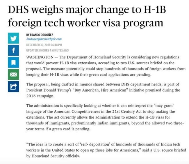 近日,美国国土安全部(DHS)正在制定停止H1B有关签证延期的新法规:将不再允许拿H1B超过六年,但已经申报绿卡(提交140表)等待排期的人留在美国继续工作。报道指出,这项措施一旦出台,将会影响到成千上万的外籍员工,很可能让他们在绿卡申请未获得批准时无法保留原来的H1B签证。对中国人(当然还有印度人)来说,去美国先读书、再找工作,最终定居的“学而优则移”的高技术移民之路将被彻底堵死。