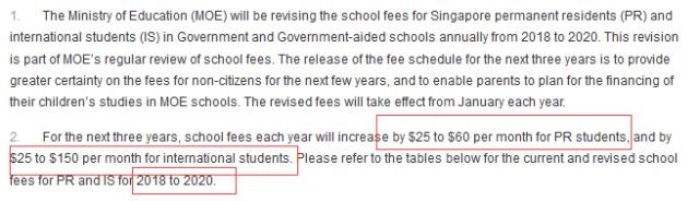 新加坡教育部出台规定,2018年1月起,就读小学的永久居民学生每月学费将上调25元至155元,接下来至2020年,每年的学费也会上调25元。就读中学的永久居民和外籍学生,学费的增幅介于60元至150元。新加坡教育部在这之前也曾于2013年与2011年调高非公民学生的学费,进一步区分公民与非公民的利益。