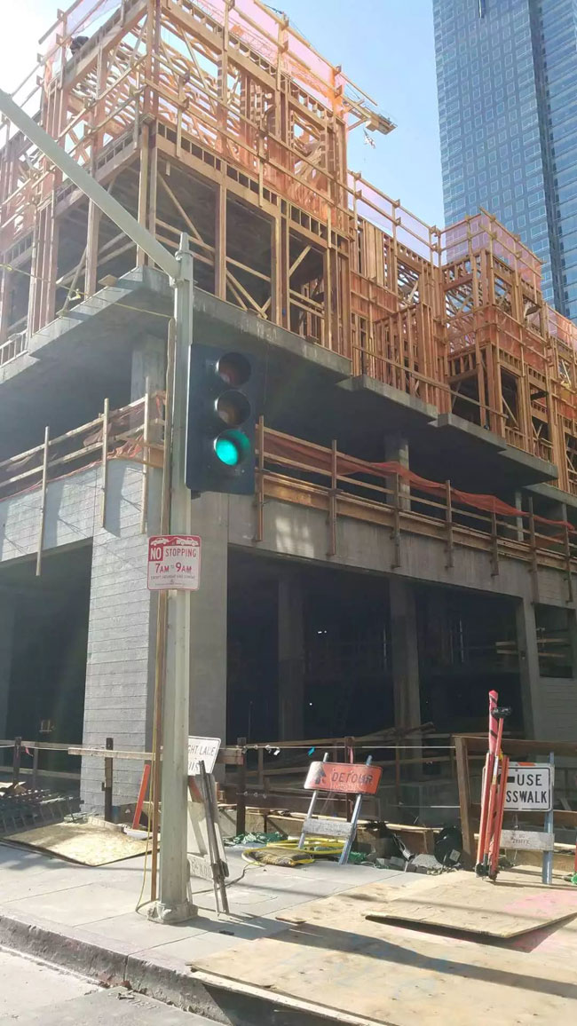 ▲1区与2区的楼梯塔已搭建,第3、4层楼层的木质架构工程正在进行中