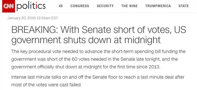 另外,据美国媒体报道,参议院在1月20日晚上已经开会讨论过,定于1月22日早上对新的临时预算案再次进行投票,此临时预算案将会使联邦政府延期到2月8日。