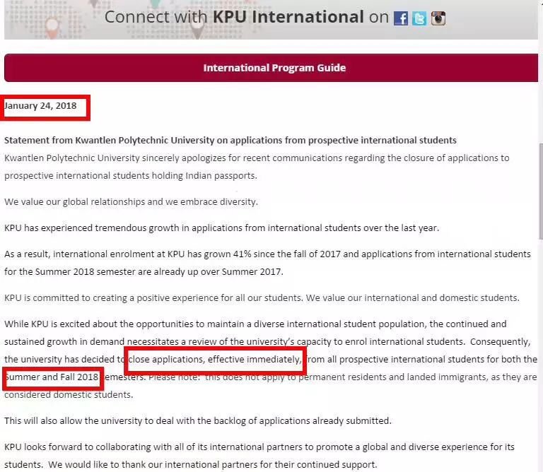 当地时间1月24日,Kwantlen Polytechnic University(KPU)官方发布消息:决定临时关闭今年5月份和9月份入学的学期,暂停接收任何来自国际留学生的入读申请,即日起效。原因是由于留学生的申请人数增长迅速,已经大大超过了该校可承载的国际生数量。已经申请了KPU的学生照常补交成绩单,等待录取OFFER。另外,这项规定只影响国际留学生,永久居民和新移民可照常申请。