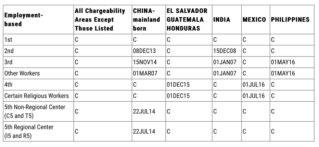中国大陆出生申请人,EB-1有名额;EB-2由2013年10月1日前进到2013年12月8日;EB-3由2014年9月15日前进到2014年11月15日;EB-4有名额;EB-5保持在2014年7月22日。