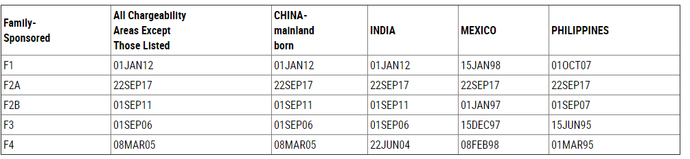 亲属移民4月“递件排期表”,中国大陆出生申请人大部分前进,具体情形如下——F-1类:保持在2012年1月1日;F-2A类:由2017年5月1日前进到2017年9月22日;F-2B类:保持在2011年9月1日;F-3类:由2005年12月1日前进到2006年9月1日;F-4类:由2005年1月22日前进到2005年3月8日。