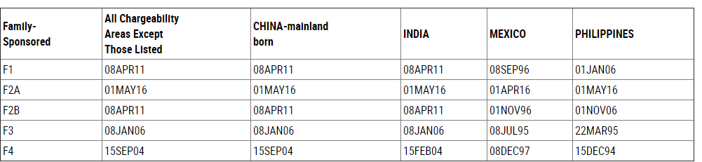 亲属移民4月“绿卡批准排期”,中国大陆出生申请人全部前进,具体情形如下——F-1类:由2011年3月22日前进到2011年4月8日;F-2A类:由2016年3月22日前进到2016年5月1日;F-2B类:由2011年3月1日前进到2011年4月8日;F-3类:由2005年12月15日前进到2006年1月8日;F-4类:由2004年8月22日前进到2004年9月15日。