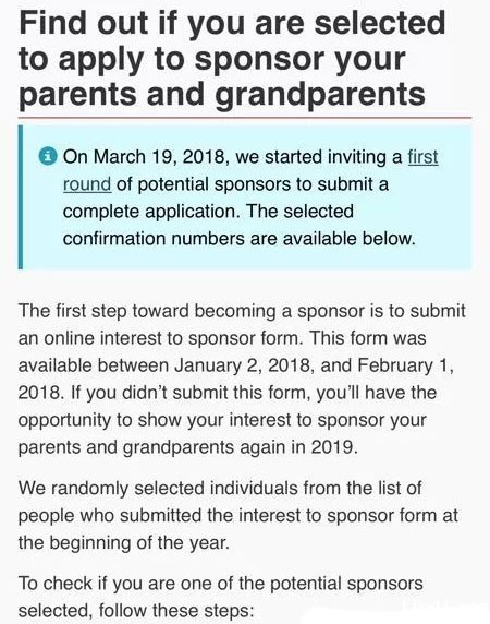 当地时间3月19日,加拿大父母团聚移民2018年的第一轮抽签结果已经公布,本次移民局共抽取了1万5千份申请。移民部计划在上周陆续向被选中的担保人发电邮,邀请他们递交完整的担保父母或祖父母申请。中签者必须在规定时间内提交全部申请材料。值得注意的是,准备材料的时间从去年的90天被缩至今年的60天。移民部表示,如果到完成申请截止的日期内没有收到1万份完整的申请,将会在今年晚些时候开始第二轮邀请。