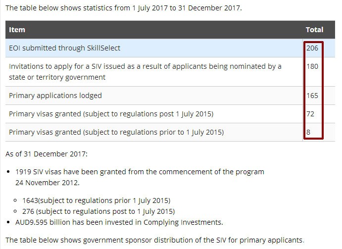 澳洲内务部官网近期公布了澳洲188C签证从2017年7月1日至12月31日的审批数据:(1)2017年下半年,澳洲移民局收到了206份EOI申请,其中有180名申请人最终拿到州担保。(2)在这半年中,于新政后(2015年7月1日后)递交的申请,有72份获得正式批准,于新政前(2015年7月1日前)递交的申请中有8份获得批准。另外,移民局也发布了澳洲188C移民签证从2012年11月24日推出至2017年12月31日的获批情况。报告显示,在过去5年多时间,澳洲移民局一共向海外人士发放了1919份188C签证的获批函,其中,旧政下获批的数量达到1643人,新政下有276人。