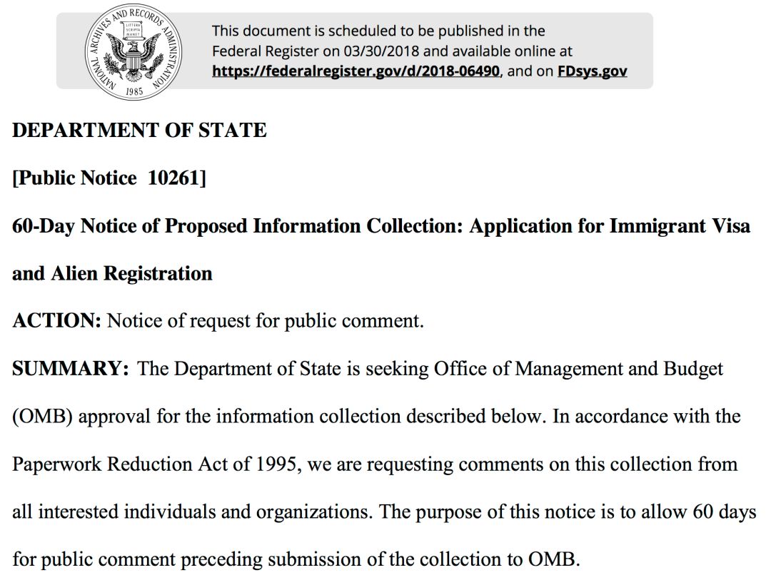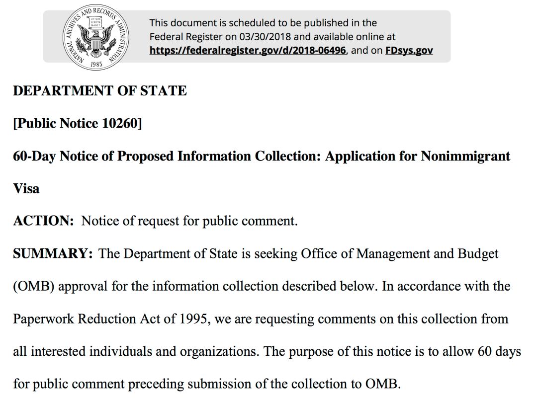 联邦当局声称,此举对国家安全是必要的。自早年以来, 政府一直希望更密切地挖掘外国访客的背景和社交媒体历史,但此次举动是第一次正式要求几乎所有签证申请者来向美国透露这些信息。另据CNN的报道,此次新规并未要求签证申请人提交社交媒体账号的密码,虽然之前国土安全部部长John Kelly曾建议要求。