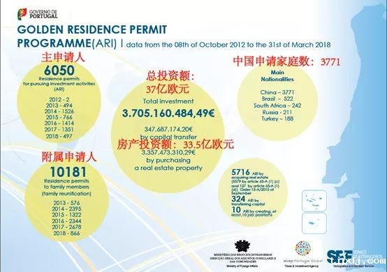 葡萄牙移民局(SEF)官方发布了截止到2018年3月31日黄金居留获批的最新数据。(1)累计投资额:目前为止,葡萄牙黄金居留许可项目总投资额约为37.05亿欧元,其中房地产贡献约为33.57亿欧元。(2)主申获批人数:3月份有174位主申请人获批,累计总共6050位投资人成功获批黄金居留许可。(3)附属申请人数:3月份有320位附属申请人成功获批,黄金居留许可累计附属申请人数为10181人。(4)投资者来源:在目前6050位获批的投资者中,中国有3771人(占比约62%)。
